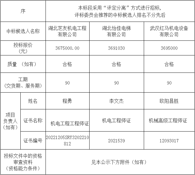 金投?新城臻品金投?新城臻品建設(shè)項(xiàng)目電梯設(shè)備采購(gòu)安裝項(xiàng)目于2024年01月10日在湖北省電子招投標(biāo)交易平臺(tái)發(fā)布招標(biāo)公告,2024年01月31日在松滋市開標(biāo)室(2)開標(biāo),并于2024年01月31日完成評(píng)標(biāo)工作。根據(jù)評(píng)標(biāo)委員會(huì)提交的評(píng)標(biāo)報(bào)告,湖北松滋金投置業(yè)有限公司已經(jīng)確認(rèn)評(píng)標(biāo)結(jié)果,現(xiàn)進(jìn)行評(píng)標(biāo)結(jié)果公示。